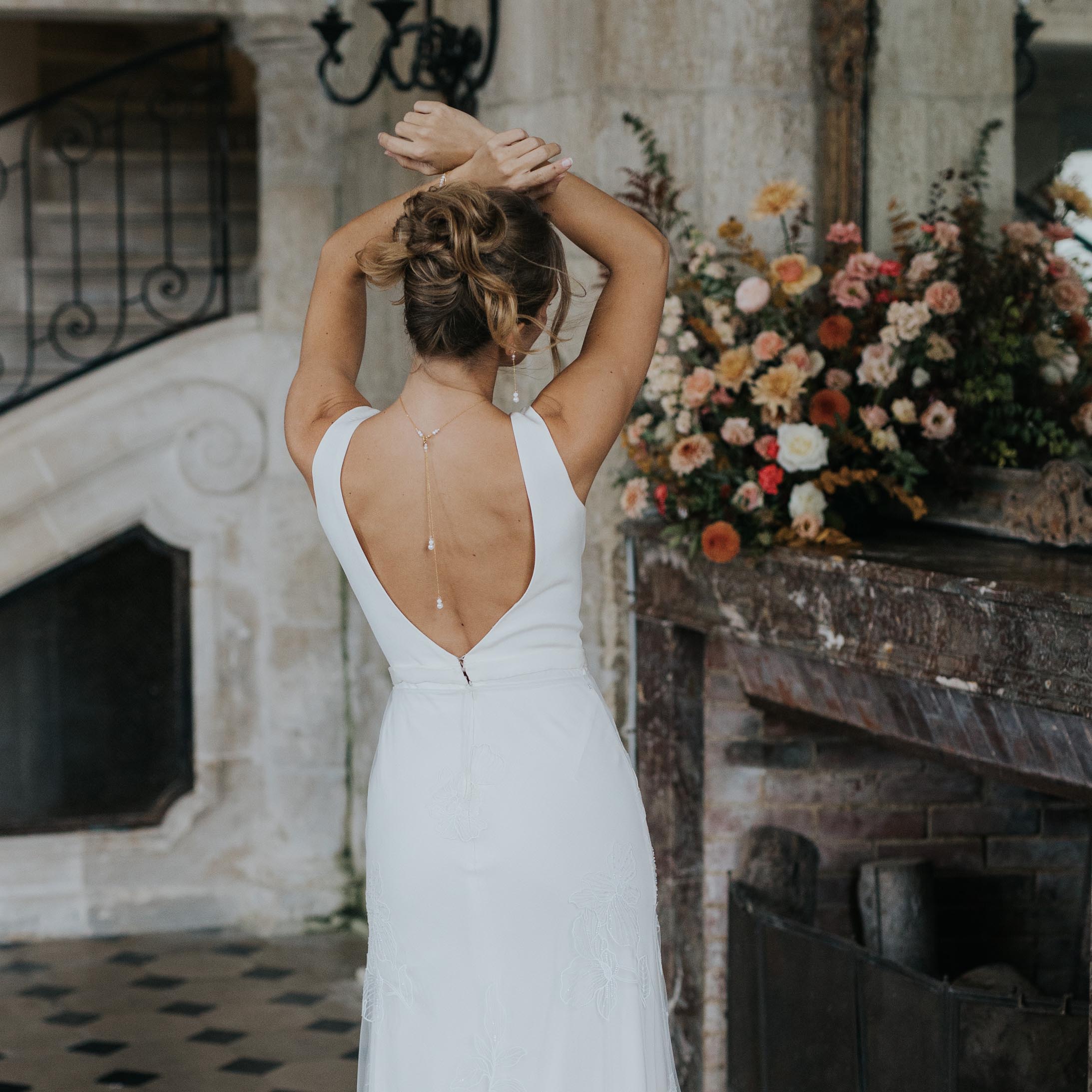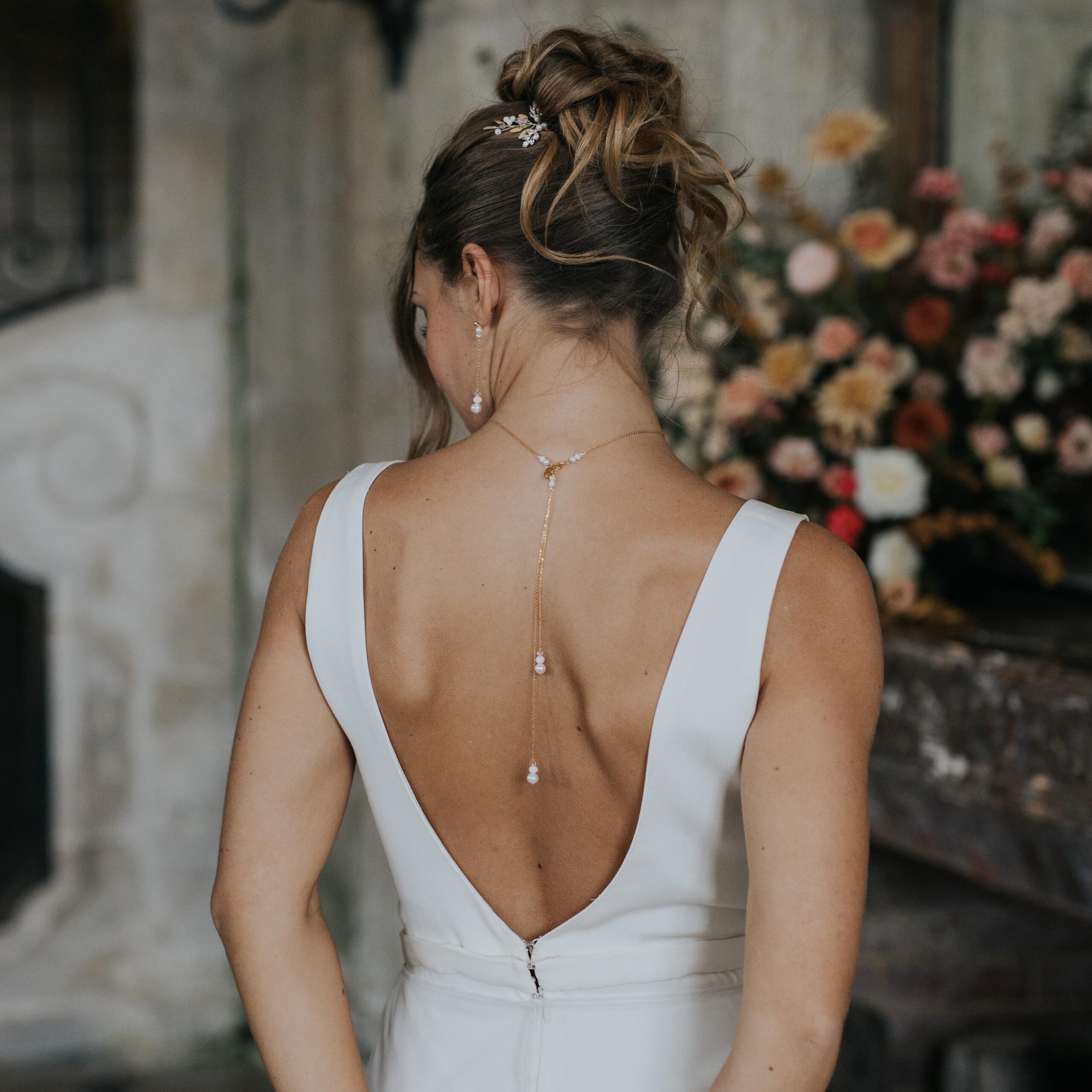 Le pendentif de dos KANDICE est un bijou de mariage empreint de douceur et de poésie. Réalisé à la main dans l’atelier Hélène Ripoll, il associe des perles d’eau douce et des perles facettées rose et nude sur une fine chaîne dorée. Léger et fluide, il habille le dos d’un éclat délicat et s’accorde à merveille avec une robe au dos nu. Ce pendentif amovible se porte sur un collier ras de cou et s’associe parfaitement au collier KANDICE pour une parure harmonieuse et romantique.
