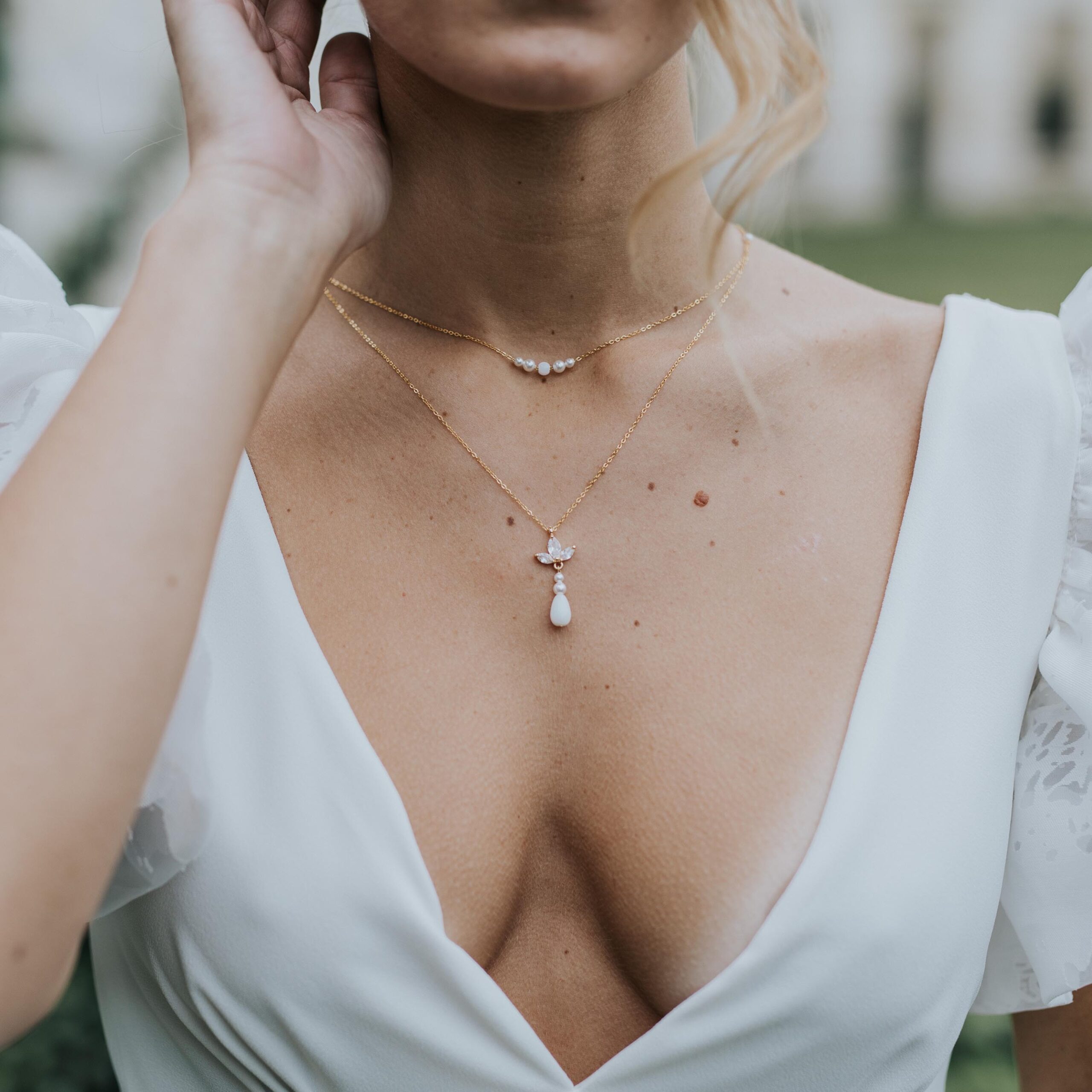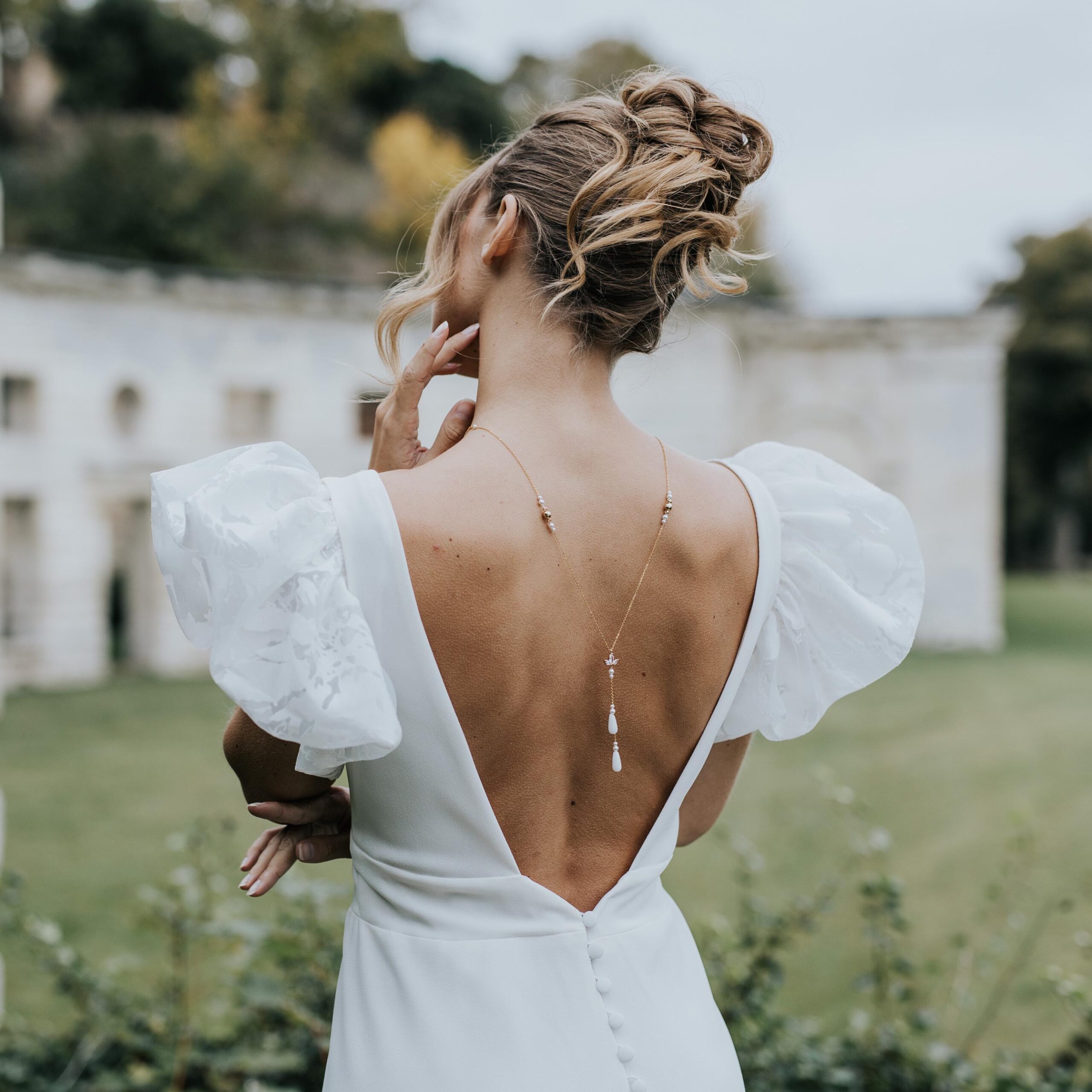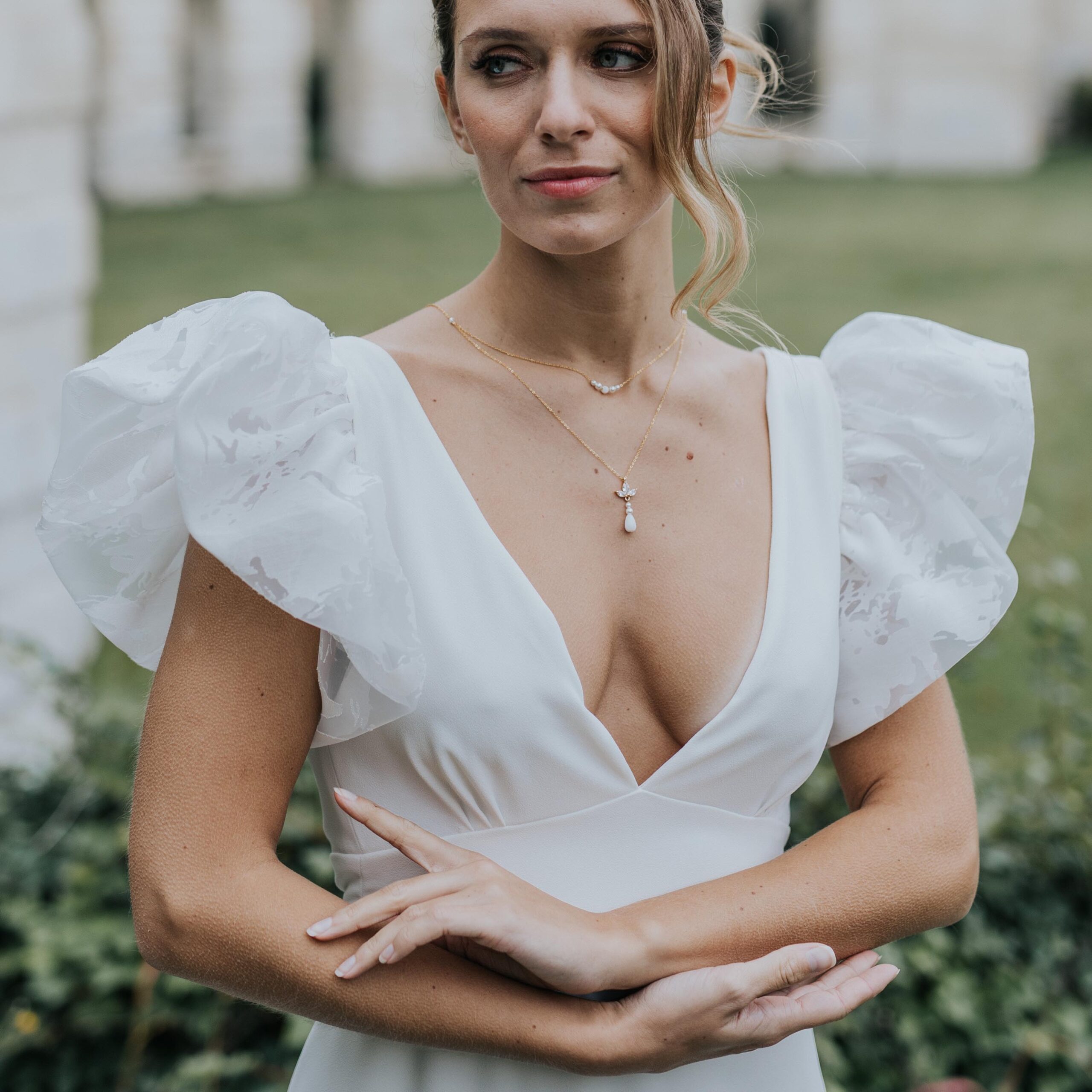 Le collier de dos amovible KISS est une pièce ingénieuse et raffinée, pensée pour la mariée moderne. Grâce à son système d’aimants discret, la partie dos se détache en un instant, permettant de transformer le bijou selon le moment de la journée : une allure sophistiquée pour la cérémonie, et une version plus sobre pour la soirée. Son pendentif mêle goutte en porcelaine, perles nacrées et feuillage strassé, pour une brillance subtile et poétique. Un bijou modulable qui allie élégance et innovation.