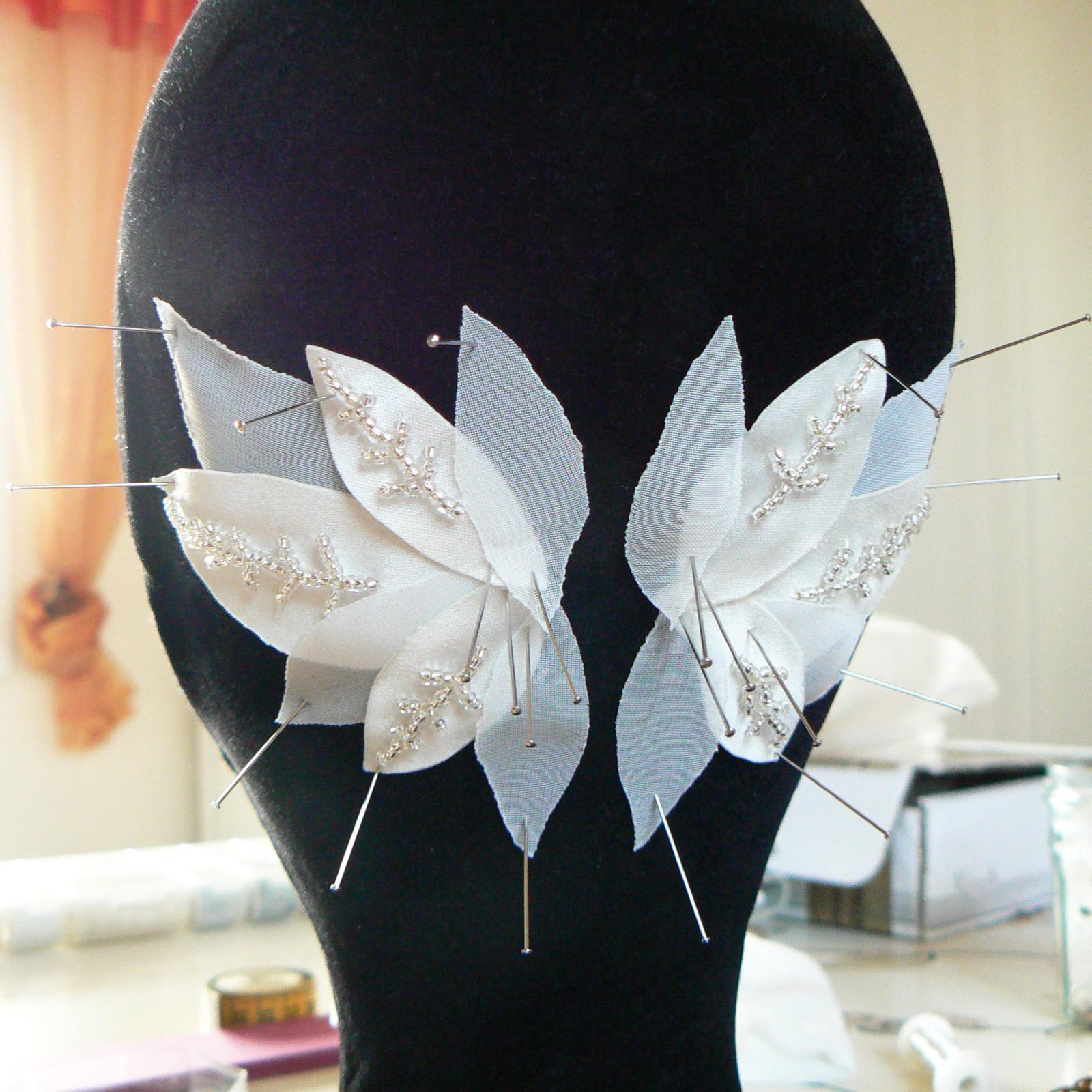 Aujourd’hui j’ai donc décidé de vous présenter le projet de Céline. il faut d’abord écouter les envies de la future mariée, les décrire, rendre tout ca cohérent avec la tenue pour un rendu harmonieux … Ensuite il faut coucher sur le papier les idées sous forme de croquis, puis sélectionner les matières. Alors, seulement, vient le temps de la naissance du projet … on taille les premières pièces, les broderies de perles prennent place, on épingle le montage pour se représenter l’ensemble et corriger si besoin. Enfin, on fixe ces « éléments » (qu’on a créés et non achetés !!!), puis les attaches qui permettront une bonne fixation dans la coiffure … Et voilà ! Et parce que Céline avait envie d’un bijou de dos, je lui ai intégré un pendant amovible qu’elle pourra enlever le soir ou remettre sur un autre collier !